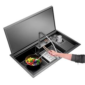 Cuba cozinha gourmet aço inox 304 preta moderna com tampa Esta cuba gourmet de cozinha em aço inox 304 é o ápice da modernidade e funcionalidade, projetada para quem valoriza praticidade e sofisticação. Com sistema automatizado e lavador de copos integrado, possui uma torneira moderna com três tipos de jato, adaptando-se a diferentes necessidades de uso. Para apresentar a mesma, salientam-se os seguintes pontos: Material de qualidade: Cuba produzida em aço inoxidável 304 de alta qualidade, com acabamento em pintura eletrostática com nanotecnologia, resulta em um produto antiferrugem, antirrisco e resistente ao desgaste. Tampa funcional: A cuba possui uma tampa que pode ser fechada após a utilização. Basta pressionar a torneira para baixo e pronto agora é só abaixar a tampa da cuba, que conta com amortecedor soft close, e sua cozinha recebe um ar clean de muita modernidade, ajudando a manter a sua cozinha organizada a qualquer hora do dia. Super torneira: Elegante torneira gourmet extensível em aço inox 304, retrátil e com 3 modos de pulverização. Mais facilidade na limpeza e na higienização de alimentos, além de praticidade na organização da pia. Acionamento do ralo: O sistema de acionamento do ralo permite que você drene facilmente a água, apenas ativando um botão e mantendo as mãos secas. Torneira filtro: Acompanha uma segunda torneira para água filtrada. O filtro de carvão ativado pode ser instalado facilmente, mas deve ser comprado separadamente. Especificações: Medidas externas: 78 x 50 x 23 cmmedidas internas: 74 x 43 x 22 cmmaterial: aço inoxidável 304acabamento: pintura eletrostática preta com nanotecnologiaespessura: 3 mmaplicação: embutir ou sobreporfuração da torneira: embutidafuração do dosador: 2,8 cmfuração do lavador de copos: 2,8 cmfuração da válvula: 4 1/2válvula escape/ladrão: simcapacidade do dispenser de detergente: 500 mlindicação: cozinha, churrasqueiracompatível com triturador: simantirruído: simacessórios inclusos: simimportante: Marca: Não Informado Ean: 7891243570213