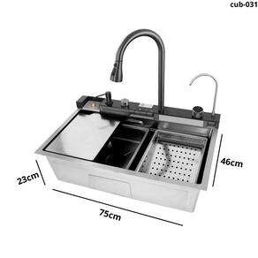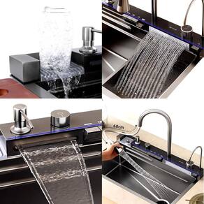 Esta cuba gourmet de cozinha em aço inox 304 é o ápice da modernidade e funcionalidade, projetada para quem valoriza praticidade e sofisticação. Com sistema automatizado toda comandada com botões, possui dois jatos de água em cascata para lavagem de louças e alimentos, adicionando um toque elegante ao design. Inclui um lavador de copos integrado para facilitar a limpeza de utensílios delicados, além de uma torneira com três tipos de jato, adaptando-se a diferentes necessidades de uso.