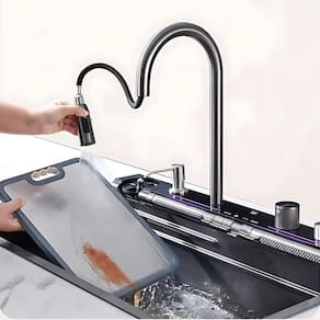 Esta cuba gourmet de cozinha em aço inox 304 é o ápice da modernidade e funcionalidade, projetada para quem valoriza praticidade e sofisticação. Com sistema automatizado toda comandada com botões, possui dois jatos de água em cascata para lavagem de louças e alimentos, adicionando um toque elegante ao design. Inclui um lavador de copos integrado para facilitar a limpeza de utensílios delicados, além de uma torneira com três tipos de jato, adaptando-se a diferentes necessidades de uso.