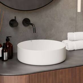 Tipo: Cuba de Apoio Redonda para Banheiro Material: Superfície Sólida Mineral Cor: Branco Acabamento: Fosco Medidas: 38 x 38 x 11,5 cm Instalação: Apoio sobre bancada Diferenciais: Formato redondo sofisticado, fácil limpeza, durabilidade e resistência Estilo: Contemporâneo, leve e elegante