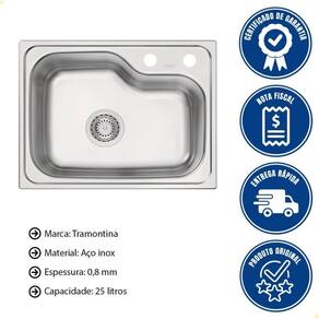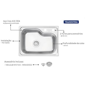 CARACTERÍSTICAS - Instalação: Por baixo. - Cuba: Simples. - Capacidade: 25 L. - Material: Aço Inox AISI 304. - Espessura: 0,8 mm. - Acabamento: Acetinado. - Profundidade da cuba: 19 cm. - Furo para torneira: Sim, 2. -Acessórios inclusos: 1 Válvula 4 e tampão para furo de torneira.
