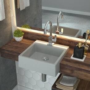 Estrutura em Mármore Sintético com acabamento em Gel Coat, semelhante a louça e responsável por criar mais resistência a peça.
