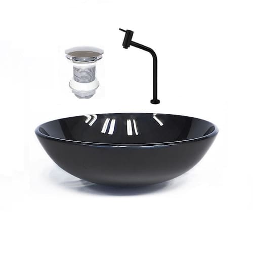 Cuba de vidro redonda 31cm preta + valvula + torneira preta as nossas cubas de vidro são ideais para projetos de decoração em banheiros com alto padrão e bom gosto, pois proporcionam um efeito moderno e único ao ambiente, são instaladas sobre a bancada e por isso realçam com destaque o acabamento do seu banheiro, sem contar a eficiência e praticidade que se leva para a sua casa. O vidro é pintados com tinta de alta performance, o que lhe garante a permanência da cor. Na compra deste super combo 3 em 1, você compra de uma só vez, a cuba redonda, válvula click e a torneira de metal preta, de forma mais fácil, mais rápido e mais barato. Dados técnicos da cuba: formato: redonda; material: vidro; instalação: apoio ou sobrepor; dimensões: 31x31x13cm comprimento x profundidade x altura ; espessura: 12mm. Dados técnicos da válvula: formato: redonda; material: polipropileno; instalação: cubas, tanques e lavatórios; diâmetro: 1. 1/4 polegadas. Dados técnicos da torneira preta: material: liga metálica preta; conexão de entrada: 1/2 polegada -1/4 volta; altura total da torneira: 37 cm; altura da queda dágua: 27 cm. Garantia de todos os itens: 12 meses conforme política de troca e devoluções . Atenção: preço referente a cuba, válvula click e torneira de metal preta. Montagem: montagem e instalação não inclusa na venda ou preço do produto, elas são de inteira responsabilidade do cliente. Imagens ilustrativas.