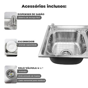 Design, Modernidade e ElegânciaA Cuba Dupla em Inox Gourmet é um dos itens mais importantes para estilizar a cozinha do seu jeito, com um design moderno e elegante, proporciona mais satisfação nas tarefas do dia a dia e devido ao seu tamanho te ajuda a economizar tempo na realização dos afazeres.A Cuba Dupla em inox gourmet é bonita, resistente e moderna, um item como esse agrega ao ambiente e evita problemas com uso repetitivo devido a resistência. Seu uso é prático e sem dificuldades, é só fazer a montagem e aproveitar de um produto de alta qualidade. Simplicidade, beleza e qualidade são os principais fatores para a escolha.A Cuba Dupla em Inox Gourmet é a melhor opção devido ao seu tamanho otimizado que permite a realização de diversas tarefas ao mesmo tempo, lavar, secar, enxaguar etc. A multifuncionalidade é seu trunfo.Com uma cuba dupla, uma pessoa poderia ter ajuda de outra na lavagem de louças, vegetais e legumes, trazendo maior velocidade nos afazeres diários e mais praticidade para a cozinha em geral.CaracterísticasFeita em material InoxAntirruído no fundoAceita a maioria dos acessórios de cozinha (trituradores e ralos)Acabamento Escovado e acetinadoMaior área para otimizar afazeres domésticosItens InclusosRalo de piaDosador de DetergenteEscorredorEspecificações da Cuba:Material: Inox 304Acabamento: Acetinado escovado circularComprimento: 77 cmLargura: 42 cmProfundidade: 20 cm