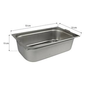 Material: Aço Inox Espessura: 0,7mm Altura total: 15CM Largura total: 32,5CM Comprimento total: 53CM Modelo: GN 1/1 150MM Marca: Stainless Steel Garantia: 30 dias (defeito de fabricação)