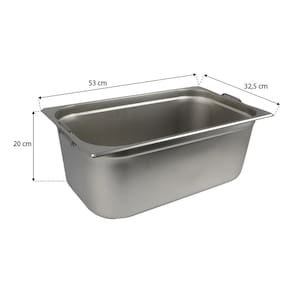 Material: Aço Inox Espessura: 0,7mm Altura total: 20CM Largura total: 32,5CM Comprimento total: 53CM Modelo: GN 1/1 200MM Marca: Stainless Steel Garantia: 30 dias (defeito de fabricação)