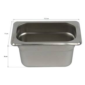 - Material: Aço Inox - Espessura: 0,7 mm - Altura total: 10 cm - Largura total: 10,8 cm - Comprimento total: 17,6 cm - Modelo: GN 1/9 – 100 mm - Tampa: Inclusa, em inox, padrão GN 1/9 - Marca: Stainless Steel - Garantia: 30 dias (contra defeitos de fabricação)