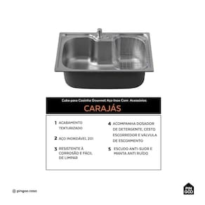 Conteúdo da embalagem: 1 Cuba Gourmet para Cozinha Carajás, 1 Cesto escorredor, 1 Dosador de detergente 300 ml, 1 Válvula de escoamento