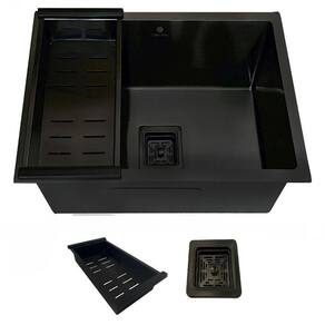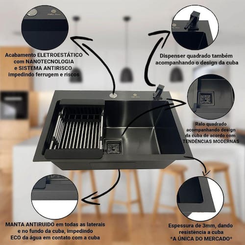 Marca: STILLUS HOME Medidas externas: 60 X 40 X 20 cm Medidas internas: 56 x 36 x 17 cm Material: Aço inoxidável 304 Espessura: 3 mm Acabamento: Aço Inox Preto Aplicação: Embutir ou Sobrepor Furação da Torneira: 3,5 cm Furação do dosador: 2,8 cm Posição da Válvula: Centralizada Furação da Válvula: 4.1/2 Indicação: Cozinha, Churrasqueira Aceita Triturador: Sim Anti-ruído: Sim Fundo e laterais Acompanha Acessórios: Sim Acompanha Sifão: Sim