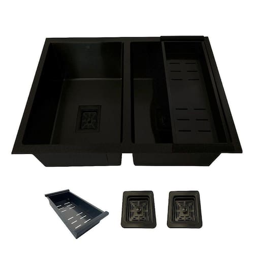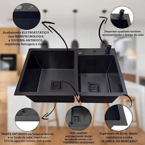 Marca: STILLUS HOME Medidas externas: 78 X 43 X 20 cm Medidas internas: 74 x 39 x 17 cm Material: Aço inoxidável 304 Espessura: 3 mm Acabamento: Aço Inox Preto Aplicação: Embutir ou Sobrepor Furação da Torneira: 3,5 cm Furação do dosador: 2,8 cm Posição da Válvula: Centralizada Furação da Válvula: 4.1/2 Indicação: Cozinha, Churrasqueira Aceita Triturador: Sim Anti-ruído: Sim Fundo e laterais Acompanha Acessórios: Sim Acompanha Sifão: Sim