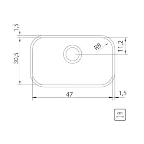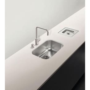 Cuba com bordas lisas para instalação por baixo da bancada e 17 cm de profundidade. Opcionalmente é oferecido como acessório a grade aramada para o fundo da cuba.