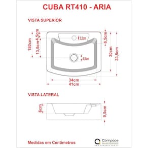 +A+cuba+RT41+Aria+tem+seu+design+diferenciado+e+um+excelente+escoamento+de+%E1gua.+Fabricada+em+m%E1rmore+sint%E9tico+com+acabamento+em+gel+coat%2C+material+bem+semelhante+a+lou%E7a%2C+muito+resistente+e+mais+econ%F4mico%21 Acabamento: 1 Acompanha Manual de Instalação: Não Altura: 9,5 cm calculo: unidade Comprimento: 41 cm Cor do Produto: Branco Cor Predominante: Branco Diâmetro do furo: 32 mm Diâmetro para válvula: 40 mm : Retangular Itens Inclusos: 1 Cuba Largura: 33,5 cm Manual de Montagem e Instalação: https://cdn2.madeiramadeira.com.br/atributo/compace/363699-instala-o-de-cubas-de-apoio.pdf Material: Mármore Sintético Origem do Produto: Nacional Peso: 4,3 kg Possui furação para torneira: Sim Possui ladrão: Não status-cadastro: Aprovado Tamanho: Válvula indicada: Válvula: 1 1/4'' (40mm) Válvula oculta: Não