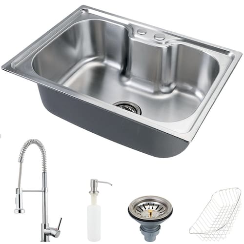 Cuba - Cesto escorredor - Dosador de detergente 300 ml - Válvula de escoamento - kit acessórios de instalação - Placa de reforço para Torneiras gourmet - Par de flexíveis de aço trançado de 50 cm - Anéis de Vedação - Sistema de fixação - Misturador monocomando Envira