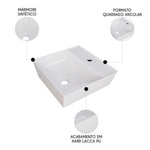 Fabricada em mármore sintético, um material composto por resina poliéster e carga mineral, com camada de Gel Coat e acabamento de pintura poliéster PU, ela é bastante semelhante à louça, porém mais econômica. A Cuba de Apoio combina resistência e durabilidade, além de já vir com furação para torneira, o que torna a instalação ainda mais prática. O acabamento em Hard Lacca PU garante brilho e proteção, proporcionando um visual sofisticado e fácil de manter.