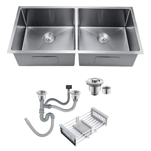 - 1x Cuba Dupla Gourmet 75x41 - 2x Válvulas 4 ½” com coador e tampa removíveis - 1x Sifão completo com sistema ladrão - 1x Cesto escorredor ajustável em inox