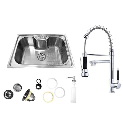 1 Cuba, 1 Cesto escorredor, 1 Dosador de detergente 300 ml, 1 Válvula de escoamento, 1 Kit acessórios de instalação, 1 Placa de reforço para Torneiras gourmet.