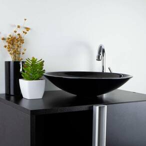 Produzida em Resina de Poliéster na cor Preta, material robusto, brilhante e de excelente acabamento, não é mármore sintético e nem plástico. Indicada para uso com torneira de bancada. Fica em cima da pia (não é de embutir). Ideal para ambientes pequenos, fica linda e diferenciada.