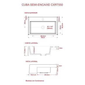 Cuba Semi Encaixe Retangular Xrt55w Colorida Cinza Sobre o ProdutoCuba de Apoio Retangular XRT55 54X36,5cm AmareloDescrição do ProdutoA cuba de Semi Encaixe XRT55 tem seu design retangular e um excelente escoamento de água, é fabricada em mármore sintético com acabamento em Hard Lacca PU, material bem semelhante a louça, muito resistente e mais econômico!!Itens Inclusos:1 Cuba de ApoioInformações Logísticas:Vol.01 - Comp.: 61cm - Prof.: 43cm - Alt.: 17cm - Peso Bruto: 8,1KgObservações:Não acompanha acessórios decorativos. Imagens meramente ilustrativas.Informações Técnicas / Características:- Cor: Amarelo- Marca: Compace- Modelo: CAXRT550- Linha: Conect- Formato: Retangular- Tipo de Cuba: Semi-Encaixe- Material: Mármore Sintético- Acabamento: Hard Lacca PU- Escala de Brilho: Brilho- Possui Ladrão: Não- Possui Furação para Torneira: Sim- Diâmetro do Furo para Torneira: (32mm) - DN 32- Diâmetro do Furo para Válvula: (40mm) - DN 40 - Comprimento: 54cm- Largura: 36,5cm- Altura: 11,5cm - Peso Líq.: 7,4Kg- Recomendações de Uso, Manutenção e Limpeza: Utilize flanela seca ou pano macio, levemente umedecido com água. Evite contato com produtos químicos e abrasivos (solventes, thinner, acetona etc) e não utilize nenhum tipo de esponja de aço. Para maior brilho, recomendamos a utilização de cera automotiva n 2.- Necessita de Montagem: Sim / Acompanha Manual de Montagem- Complexidade da Montagem: Média: pode ser montado por mais de uma pessoa e/ou necessite de maior conhecimento para montagem.- Garantia: 6 meses Formato: Retangular | Tipo de Cuba: Semi-Encaixe | Material: Mármore Sintético | Acabamento: Hard Lacca PU | Escala de Brilho: Brilho | Possui Ladrão: Não | Possui Furação para Torneira: Sim | Diâmetro do Furo para Torneira: (32mm) - DN 45 | Diâmetro do Furo para Válvula: (40mm) - DN 53 | Limite de unidades por venda: É possível comprar até 1 unidade por venda. | Quantidade máxima de pedido: 1 | Baterias são necessárias?: false Cor: Cinza