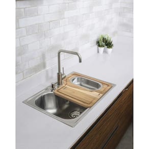 Produto: Cuba de sobrepor com 20,3 cm de profundidade. Acompanha válvula de 4.1/2'' luxo, tábua em madeira, dosador de sabão e cesto coador em inox. Opcionalmente são oferecidos acessórios como, cesta quadrada e grade aramada.