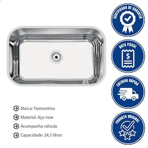 - Pensando em você a Tramontina desenvolveu a Cuba Tramontina Lavínia 56 BL Standart em Aço Inox Polido 56x34 cm que alia bom gosto e praticidade.