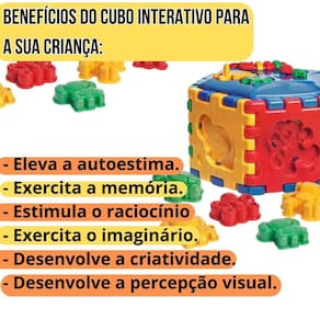 Cubo Interativo Monta e desmonta Brinquedo Educativo Animais Solapa Cubo Interativo Monta e desmonta Brinquedo Educativo Divplast Solapa Desenvolva a curiosidade e o aprendizado dos pequenos com o Cubo Interativo Didático, um brinquedo multifuncional que combina diversão e educação de forma envolvente e . Ideal para crianças a partir de 6 meses, este brinquedo foi projetado para promover o desenvolvimento cognitivo e motor de maneira lúdica e interativa. características do Produto: -Design Modular e Versátil: O cubo pode ser facilmente desmontado e montado aberto no chão, permitindo que as crianças interajam com todos os lados do brinquedo ao mesmo tempo. Isso oferece uma experiência de brincar mais dinâmica e acessível, mantendo o interesse dos pequenos em diferentes atividades. -diversidade de Atividades:-Formas Geométricas: Inclui 6 formas geométricas coloridas que podem ser encaixadas em seus respectivos espaços. Esta atividade ajuda na identificação de formas e cores, além de desenvolver habilidades de coordenação motora fina.-engrenagens e Rolinho Giratório: Engrenagens com figuras de animais e um rolinho giratório proporcionam diversão interativa e ensinam causa e efeito de forma prática.- Puzzles Coloridos: O cubo vem com 4 puzzles divertidos - borboleta, macaco, leão e elefante - que desafiam as crianças a resolver problemas e melhorar suas habilidades de reconhecimento visual e solução de problemas. -benefícios Educacionais:-Desenvolvimento Cognitivo: Estimula o raciocínio lógico e a percepção ao incentivar a criança a identificar formas, cores e padrões.-coordenação Motora: As atividades de encaixar formas, girar peças e montar puzzles ajudam a melhorar a coordenação motora fina e a destreza manual.-concentração e Aprendizado: Proporciona um ambiente de aprendizado interativo, ideal para ensinar conceitos básicos de forma divertida e envolvente. -material e Estrutura: Fabricado em plástico durável e colorido, o cubo é resistente e fácil de limpar, garantindo longas horas de diversão sem preocupações com desgaste. As dimensões do cubo são:-Comprimento: 27 cm-Largura: 20 cm-Altura: 30 cm -Portabilidade e Versatilidade: Leve e compacto, o cubo é ideal para brincar em diversos ambientes - no tapete de atividades, no chão do quarto, no cercadinho ou até mesmo ao ar livre. Pode ser levado facilmente em passeios, no carrinho de bebê, ou Utilizado em ambientes escolares e pedagógicos. -estímulo à Aprendizagem e Interação: Além de entreter, o cubo serve como uma ferramenta pedagógica que pode auxiliar crianças com necessidades especiais, como e déficit de atenção, proporcionando um meio de aprendizado inclusivo e divertido. O Cubo Interativo Didático é mais do que um brinquedo - É uma ferramenta educacional completa que combina aprendizado e diversão. Proporcione às crianças uma experiência rica e envolvente, desenvolvendo suas habilidades enquanto elas brincam e exploram. Adicione este brinquedo essencial ao seu carrinho e observe como ele encanta e educa ao mesmo tempo Homologação Inmetro: 7355/2021-BRI-1