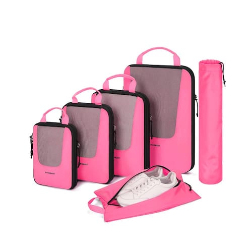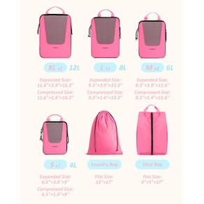 Os cubos de compressão para viagem têm 6 bolsas: 1 bolsa extragrande, 1 bolsa grande, 1 bolsa média, 1 bolsa pequena, 1 bolsa de sapato, 1 bolsa de lavanderia. Diferentes tamanhos podem ser utilizados para diferentes fins de embalagem e permitem que você leve mais roupas. Organizadores de bagagem essenciais de viagem para malas. Presentes de Dia das Mães para a mãe, presentes exclusivos de Dia das Mães da filha. - Cubos de compressão – Você está cansado do tipo de mala bagunçada para viagem? Viaje com BAGSMART PACKING CUBES e eles fazem toda a diferença. Os cubos de embalagem de 6 peças contêm 4 cubos de viagem + 1 saco de roupa suja + 1 bolsa de sapato, mantém suas roupas em cubos de compressão separados e deixa sua bagagem limpa e limpa durante a viagem - Economize até 60% de espaço – um cubo de compressão leva o espaço da bagagem para o próximo nível. É feito adicionando um zíper extra ao redor do lado de fora que pode ser fechado para minimizar o espaço interno — como um selador a vácuo funciona, mas não um vácuo - Organizador de mala durável – o conjunto de bolsas de embalagem é leve, resistente a rugas e bastante durável. A malha resistente a rasgos é fina e forte, respirável enquanto você pode encontrar o que deseja a tempo. Os zíperes duplos da marca SBS não são apenas lisos, mas também fornecem garantia de qualidade ao comprimir. Presentes de Dia das Mães para a mãe, presentes exclusivos de Dia das Mães da filha. - Essenciais de viagem leves – o tecido ultraleve garante que as roupas caibam perfeitamente em sua bagagem sem adicionar peso extra. Além disso, as alças na parte superior de cada cubo facilitam pegar as bolsas para embalar e desembalar da sua mala de mão - Conjunto de bolsas organizadoras de 30 L - O conjunto de 6 peças de grande capacidade inclui um extra grande (capacidade: 12L) para jaquetas/casacos, grande (capacidade: 8L) para jaquetas/suéteres/calças, médio (capacidade: 6L) para vestidos/camisas/blusas, pequeno (capacidade: 4L) para roupas íntimas. Saco de roupa suja (45 x 33 cm) com cordão para separar suas roupas sujas e molhadas, e o tamanho da bolsa de sapatos é de 43 x 23 x 12 cm
