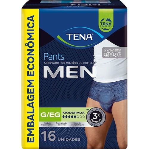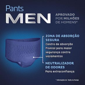 TENA Pants MEN é uma roupa íntima descartável que veste como cueca, desenvolvida especialmente para homens com incontinência urinária moderada que buscam conforto, discrição, segurança contra vazamentos e manter o cuidado com a pele. Possui neutralizador de odor e uma zona de absorção segura, formato anatômico que se ajusta perfeitamente ao corpo proporcionando conforto, facilidade de uso e discrição. A segurança deve-se especialmente à uma zona de absorção frontal que absorve rapidamente a urina, mantendo-a longe da pele e assim, deixando-a seca, auxiliando a reduzir o risco de irritações ou infecções cutâneas. TENA Pants MEN é ideal para homens ativos, discreto como uma cueca, com controle de odor e alta absorção.