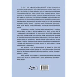 O livro é uma viagem no tempo, na medida em que vou e volto em permanente peregrinação por lugares que frequentei na infância, depois juventude e, por fim, na vida adulta. Assim, por meio dos três ambientes literários que ofereço para leitura, quais sejam, crônicas, outras reflexões e poemas, procuro construir um edifício literário que contemple em sua estrutura meu carinho pela cidade que escolhi para viver, minha religiosidade, meu respeito aos valores históricos dos acontecimentos que promovem as mudanças comportamentais nas pessoas e nas instituições, ao mesmo tempo em que viajo pelos poemas antológicos, em que enalteço o amor por minha companheira, meus filhos e netos, outras pessoas, momentos e lugares que carrego em minha memória afetiva. No segmento “Crônicas” faço um passeio nostálgico pela Cuiabá dos anos 60, época em que vivi próximo à antiga Igreja Matriz do Bom Jesus de Cuiabá e das praças centrais que, por sinal, cercam-nas em dois de seus lados; falo de meu regresso, então como um jovem que se espanta com as mudanças do progresso e o descuido com o passado arquitetônico e cultural da cidade, ao mesmo tempo em que encontra pessoas queridas; traço uma linha que une passado e presente, relatando minhas relações com meus pais, irmãos, parentes e amigos, meus sentimentos e formação familiar, em que o respeito e a moral eram exaltados e incentivados. Em “Reflexões”, viajo por ambientes que me atingem de forma mais contundente no que se refere ao modo de ver e sentir os reflexos do tempo e das ações que se traduzem em mudanças comportamentais, como as amizades, o trabalho e a família. E em “Poemas”, sigo o coração e o instinto em elucubrações sobre temas como o amor, a vida, os amigos, lugares e outros pensamentos libertos que a mente produz.
