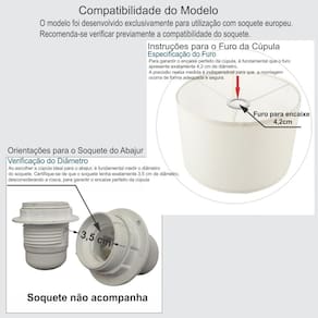 É exclusivamente para fixação do soquete bocal furo 4,2cm. O produto composto apenas a cúpula, não acompanha abajur. Resistente á maresia, garantia 1 ano após recebimento. Sua utilização para bases e pedestal de abajur, abajur de quarto, abajur de sala, abajur de cabeceira, abajur moderno, luminárias e pendentes.