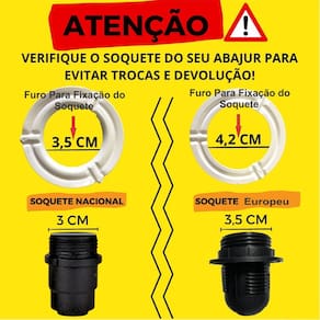É exclusivamente para fixação do soquete bocal furo 3,5cm. O produto composto apenas a cúpula, não acompanha abajur. Resistente á maresia, garantia 1 ano após recebimento. Sua utilização para bases e pedestal de abajur, abajur de quarto, abajur de sala, abajur de cabeceira, abajur moderno, luminárias e pendentes.