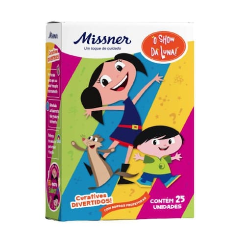 - os curativos do show da luna são autoadesivos - práticos para serem utilizados no dia a dia - um machucado protegido com o curativo da missner possui menos risco de infeccionar, pois fica protegido contra sujeira, germes e atrito - curativo possui microfuros que permitem o ferimento respirar mesmo estando coberto - cada caixa contém 25 unidades de curativos, com 5 estampas diferentes - não gruda no ferimento - almofada antiaderente - reforço no adesivo para maior fixação