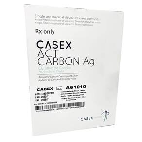 Curativo de carvão ativado e prata - Casex Act Carbon Ag Contém 10 unidades Esterelizado poe óxido de etileno O carvão ativado Act Carbon Ag é constituido por uma manta de tecido de carvão ativado de 120g/m2 impregnado a 0,15% De nitrato de prata envolto externamente por um tecido não tecido de rayon de 30g/m2, com baixa aderência. Controla a infecção e o odor. Principios de ação A camada de não tecido propicia o fluxo de exsudato para o tecido de carvão ativado que retém as bacterias, as quais são inativadas Pela ação bactericida da prata. Indicações - Feridas exsudativas, infectadas, crônicas ou agudas, superficiais ou profundas e com odor desagradável. Informações úteis - Não pode ser cortado - Pode ser colocado em qualquer uma das faces em contato com a ferida - Utilize um curativo secundário para manter o curativo Act carbon Ag no lugar - O curativo Act Carbon Ag pode ser mantido por 3 a 7 dias Observações O curativo Act Carbon Ag faz a absorção das substâncias químicas liberadas pelas feridas, a prata oferece uma ação bactericida. A cicatrização torna-se acelerada pela função bactericida, exercida pela prata, complementando a ação do carvão como Do tecido de granulação. Informações Gerais - tamanho: 10,5 x 10,5cm - Quantidade: 10unidades Marca: casex ANVISA: 10222320009