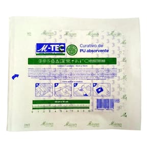Curativo de Filme de Poliuretano Absorvente M-TEC O Curativo de Filme de Poliuretano PU com adesivo hipoalergênico e uma almofada absorvente central, protegidos por um papel siliconizado, reduz risco de infecção por prevenir acúmulo de umidade. O filme de poliuretano M-TEC possui alta permeabilidade aos vapores de água, prevenindo o acúmulo de umidade embaixo do curativo, reduzindo o crescimento bacteriano e o risco de infecção relacionado ao cateter. É indicado como curativo primário apenas para absorção e proteção de feridas de baixa a moderada exsudação ou cortes pequenos, ou abrasões. Pode ser Utilizado também como curativo pós operatório para proteção de incisões cirúrgicas. Características: - Super fino e transparente - Almofada Absorvente - Fixação de Curativos Primários ou de baixa aderência - Reduz riscos de infecção, pois o filme de poliuretano é à prova de água, bactérias e vírus - Curativo respirável, evitando a maceração da pele - Adesivo sensível à pressão hipoalergênico, com boas propriedades de adesão e não deixa resíduos na remoção - Curativo possui sistema de aplicação estilo moldura para facilitar o manuseio - Macio e adaptável - Produto Estéril Composição: - Composto por uma película de poliuretano PU transparente com uma camada adesiva acrílica hipoalergênica, uma almofada central não aderente de não tecido de viscose, protegidos por um papel siliconizado - Possui na parte externa uma camada de papel que atua como um sistema de fácil aplicação do filme retirado assim que o curativo é aplicado - Isento de látex Registro ANVISA: - 80003300029