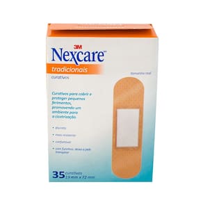 CURATIVO NEXCARE TRADICIONAL Curativos para cobrir e proteger pequenos ferimentos, promovendo um ambiente para a cicatrização. Discreto Mais resistente Confortável Com furinhos; deixa a pele transpira Marca: Não Informado