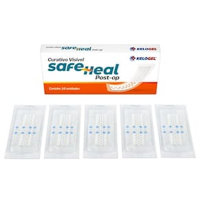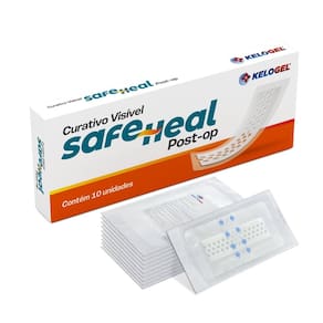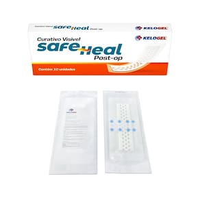Curativo visível safe heal post-op 10x20 5x15 5un kelogel Tamanho: 10x20cm O curativo visível safe heal post-op kelogel é um curativo estéril com design inovador que permite monitorar feridas sem trocas desnecessárias. É translúcido, maleável, impermeável e possui uma almofada de espuma em formato de colmeia para visibilidade. Sua aplicação é facilitada por tiras destacáveis e um filme de poliuretano.