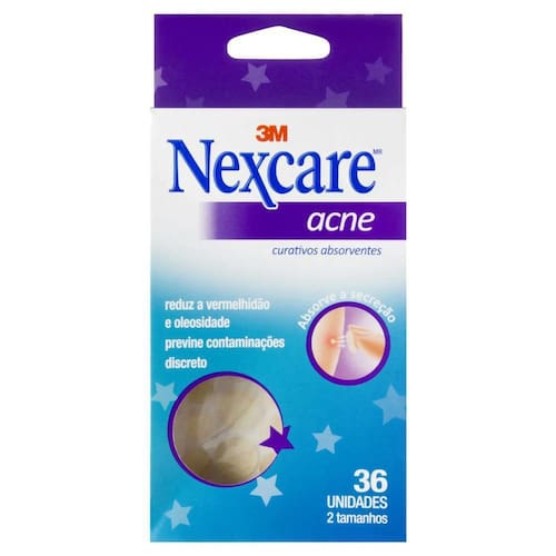 Atuam como uma barreira protetora para reduzir a exposição da acne ao meio externo e às contaminações e secar a espinha. Também contam com gel hidrocolóide que melhora a aparência da pele. Para utilizá-los, você deve simplesmente retirar o curativo para acne e aplicá-lo na espinha, sem a necessidade de cremes ou remédios. Eles trabalham em uma variedade de tipos de pele, reduzindo a vermelhidão, a oleosidade e deixando a pele transpirar. Além disso, são à prova dágua. Os Curativos Absorventes para Acne Nexcare são discretos, disfarçando a espinha e formando uma proteção firme que ainda diminui a sua vontade de espremer a acne. São confortáveis, permitem o uso de maquiagem e não são nem possuem medicamentos. Você verá com clareza que os curativos estão trabalhando na sua pele, e logo comprovará seus ótimos resultados. Embalagem com 36 unidades, em dois tamanhos diferentes, para atender melhor às suas necessidades.
