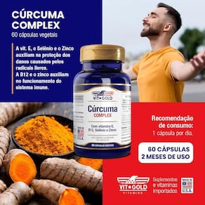 Suplemento alimentar de Cúrcuma, Vitamina E, Vitamina B12, Selênio e Zinco Vitgold em cápsulas vegetais. O Cúrcuma Complex contém em sua formulação Cúrcuma, Vitamina E, Vitamina B12, Selênio e Zinco. Recomenda-se o consumo de apenas 1 cápsula por dia. O frasco contém 60 cápsulas vegetais, suficientes para dois meses de uso. Recomendação de consumo: Sugere-se 1 cápsula ao dia durante a principal refeição. Produto isento da Obrigatoriedade de Registro conforme RDC nº240/18. Fabricado nos Estados Unidos. Marca: Não Informado Ean: 850054952554