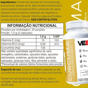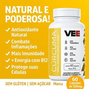 Potencialize sua saúde com a força da natureza! O Suplemento de Cúrcuma com Vitaminas B12 e E da VEE oferece uma combinação poderosa de ingredientes antioxidantes e anti-inflamatórios naturais para proteger seu corpo dos danos causados pelos radicais livres, fortalecer o sistema imunológico e promover bem-estar diário. Benefícios que você sente no dia a dia: • Combate inflamações naturais no corpo • Fortalece a imunidade • Ação antioxidante e antienvelhecimento • Mais energia com a vitamina B12 • Proteção celular com a vitamina E • Suporte às articulações e ao sistema digestivo