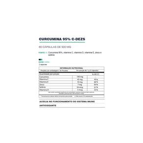 INGREDIENTES: Extrato de rizomas de cúrcuma longa (Curcumina), ácido ascórbico (vitamina C), bisglicinato de zinco, acetato de D-alfa-tocoferol (vitamina E), selenito de sódio (selênio), colecalciferol (vitamina D), dióxido de silício, estearato de magnésio e silicato de magnésio.