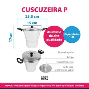 Cuscuzeira de alumínio pequena com tampa, prepare o cuscuz perfeito com praticidade e sabor Nossa cuscuzeira de alumínio com tampa é ideal para quem valoriza tradição e eficiência na cozinha. Com um design que garante cozimento uniforme, ela preserva a textura macia e o sabor autêntico do cuscuz nordestino. Leve, durável e fácil de usar, é indispensável para o dia a dia. Transforme suas receitas com a cuscuzeira que faz a diferença Características: Panela a vapor para cuscuz pequena - proção individual Peneira removível com puxador Pode ser Utilizado para cozimento a vapor de legumes, peixes e outros alimentos Feita de alumínio polido de alta qualidade Alças reforçadas Prática Durável Eficiente Aquecimento rápido e uniforme Certificada pelo Inmetro 427/2019 Acompanha manual de uso Compre nesse anúncio com segurança pelo Grupo Mega, somos um e-commerce com mais de 20 anos de atuação. Especificação: Modelo: Cuscuzeira pequena Marca: Erca / GH3 Material: alumínio e polipropileno Capacidade: 1,2L Embalagem: plástico envolto não possui caixa Tamanho: 25,5 x 17 cm diâmetro x altura Peso total: 207g. Obrigado pela visita e boas compras ATENÇÃO Nossas imagens e textos são registrados e com direito de uso autoral controlado e reservado a essa loja e as lojas parceiras devidamente autorizadas em contrato.