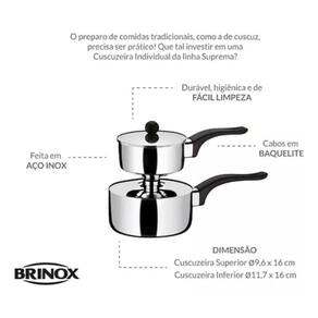 Cuscuzeira Individual - Suprema Brinox A Cuscuzeira Individual Suprema É Feita Em Aço Inox, Material Durável, Higiênico E De Fácil Limpeza. Possui Cabos Em Baquelite. Como O Próprio Nome Diz, É Ideal Para Preparar Porções Individuais Do Delicioso Cuscuz. O diferencial da Cuscuzeira Brinox é possuir estrutura em aço inoxidável polido, sem revestimento. Caracteristicas: Marca: Brinox Linha: Suprema Material: Aço Inoxidável Dimensões aproximadas: Cuscuzeira Superior: 9,1cm x 7,5cm Cuscuzeira Inferior: 11,8cm x 6cm Capacidade: 250mL 7896502851874 Marca: Não Informado Ean: 7895209627904