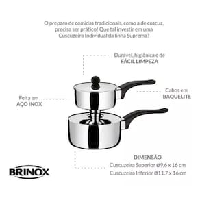 Cuscuzeira Individual - Suprema Brinox A Cuscuzeira Individual Suprema É Feita Em Aço Inox, Material Durável, Higiênico E De Fácil Limpeza. Possui Cabos Em Baquelite. Como O Próprio Nome Diz, É Ideal Para Preparar Porções Individuais Do Delicioso Cuscuz. O diferencial da Cuscuzeira Brinox é possuir estrutura em aço inoxidável polido, sem revestimento.