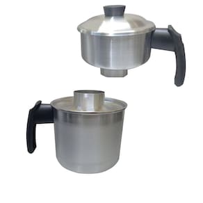 Composto por um caneco em alumínio reforçado para ferver água e duas peças de alumínio para fazer o cuscuz com respectivo cabos de baquelite A Cuscuzeira Individual, conta com o seu material em aluminio facilitando o preparo e seu cabo em Baquelite, que dessa forma facilita tambem o seu manuseio
