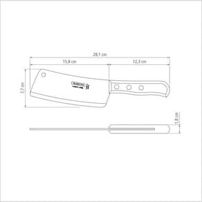 Melhore seu desempenho na cozinha utilizando o Cutelo Tramontina com Lâmina em Aço Carbono com Cabo de Madeira 6 polegadas. Um item que torna o preparo das suas receitas ainda mais prático, tem lâmina produzida em aço carbono com acabamento em verniz protetor, além de ser submetido a um tratamento térmico que garante qualidade no fio de corte, qualidade essencial para separar a carne dos ossos. Seu cabo é em madeira rústica finalizada com rebites de alumínio e além de proporcionar um manuseio muito confortável, ainda deixa sua cozinha muito mais bonita! Orientações Ideal para quebrar e separar os ossos.Lâmina de aço carbono com maior durabilidade e resistência do fio de corte. Cabo de madeira.Rebites de alumínio. Observações Produto cortante e perfurante, tenha cuidado ao manusear e mantenha fora do alcance das crianças.As facas com lâmina de aço carbono se caracterizam por uma maior resistência do fio, o que lhe confere bom poder de corte e são facilmente afiadas. Entretanto essa propriedade do aço carbono dá uma propensão maior à oxidação e descoloração do aço, se não forem tomados alguns cuidados básicos como:Sua faca é uma ferramenta de corte, não a utilize para fins inadequados. Procure mantê-la sempre afiada. Evite procedimentos que possam danificar o fio. Recomendam-se operações de corte sobre uma prancha de madeira ou plástico, que além de proteger as superfícies da sua cozinha, retardam o desgaste do fio da faca. Lave-a após cada utilização com água morna e seque-a imediatamente, evitando assim que a faca seque naturalmente, pois a umidade é a maior inimiga de sua faca carbono.Ao guardar sua faca carbono proteja a lâmina com algum óleo protetivo, o que reduzirá a possibilidade de oxidação. O azeite comestível é uma das alternativas.Recomenda-se o uso de tábuas de polipropileno ou madeira da Tramontina para maior durabilidade do fio da faca.Não é indicado o uso da faca para o corte de alimentos congelados. Mantenha sempre sua faca afiada utilizando os afiadores da Tramontina. Para descarte dos produtos e embalagens siga as orientações de reciclagem vigentes. Características Gerais EAN13 7891112019461 DUN14 17891112019468 NCM 8214.90.90 Peso Líquido 0,2330 kg. Peso Bruto 0,2700 kg. Metragem 0,000658 m³. Dimensões Embalagem (Compr. X Larg. X Alt.) 19x 105x 330 mm. Dimensões Produto (Compr. X Larg. X Alt.) 281x 77x 18 mm.