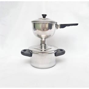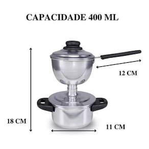 A cuscuzeira individual não pode faltar em sua cozinha ela é feita em alumínio de alta resistência e durabilidade e possui cabos E pegador em baquelite antitérmico para dar segurança ao manuseio.