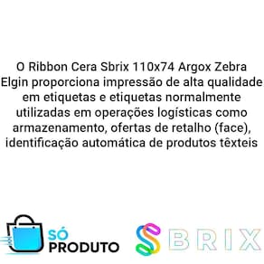DESCRIÇÃO O Ribbon Cera Sbrix 110x74 Argox Zebra Elgin proporciona impressão de alta qualidade em etiquetas e etiquetas normalmente utilizadas em operações logísticas como armazenamento, ofertas de retalho (face), identificação automática de produtos têxteis