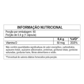 Benefícios - auxilia no fortalecimento dos ossos - auxilia no fortalecimento do sistema imunológico - previne o envelhecimento precoce - auxilia nas funções cerebrais Ingredientes Colecalciferol vitamina d . Agente de massa: amido de milho, antiumectantes: dióxido de silício e estearato de magnésio. Composição da cápsula: gelatina, corante: dióxido de titânio ins 171 . Não contém glúten. Alérgicos: contém derivados de soja. Sugestão de consumo Ingerir 1 cápsula ao dia.