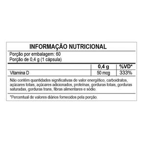 Colecalciferol vitamina d . Agente de massa: amido de milho, antiumectantes: dióxido de silício e estearato de magnésio. Composição da cápsula: gelatina, corante: dióxido de titânio ins 171 . Não contém glúten. Alérgicos: contém derivados de soja.