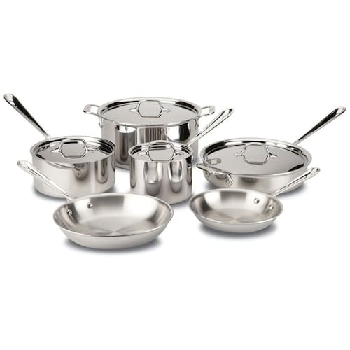 O conjunto inclui frigideiras de 8 e 10 polegadas, panelas de molho de 2 e 3 litros com tampa, frigideira de 3 litros com tampa e panela de 8 litros com tampa Construção clássica de três camadas, feita com um núcleo de alumínio responsivo unido com 2 camadas de aço inoxidável durável em toda a volta para máxima durabilidade e distribuição de calor rápida e uniforme Protegido com alças de aço inoxidável rebitadas para garantir uma aderência segura e adicionar um pouco de estilo com tampas de aço inoxidável para combinar