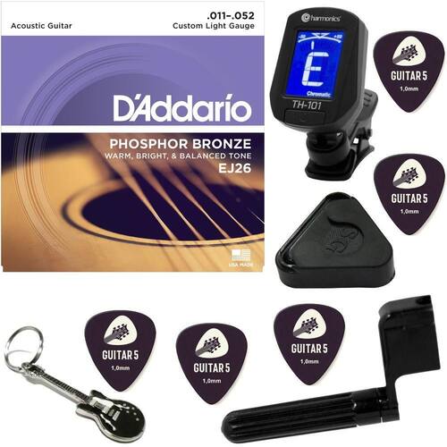 Daddario ej26 phosphor bronze corda violão aço 011 + kit iz2 Se você procura por cordas e também acessórios de alta qualidade, esse é o combo ideal. Em uma única compra e também aproveitando o mesmo você leva esse kit especial que conta com o seu encordoamento preferido juntamente com os acessórios escolhidos a dedo para que você não precise se preocupar em ficar procurando esses produtos separadamente. Aproveite faça sua compra agora mesmo Descrição dos produtos: Encordoamento violão aço 011 daddario phosphor bronze ej26 custom light gauge As cordas d'addario proporcionam o timbre e brilho que você procura para o seu violão, são usadas por grandes músicos no brasil e em todo o mundo. Conhecidas como custom light, as ej26 são as híbridas daddario e um compromisso confortável para músicos que desejam a profundidade e projeção de bordões leves, mas uma tensão menor nas cordas agudas para bends fáceis. As cordas daddario phosphor bronze são mundialmente reconhecidas por profissionais e amadores por seu timbre duradouro. O phosphor bronze foi introduzido na fabricação de cordas pela daddario em 1974. A partir de então tornou-se a escolha preferencial de grandes músicos em todo o mundo, tanto para palco, como para estúdio. As cordas daddario phosphor bronze são uma referência para todas as cordas de violão. Conteúdo da embalagem: 6 cordas Tensão das cordas: .011 / .015 / .022 / .032 / .042 / .052 Fornecedor: musical express distribuidor oficial dos produtos d'addario no brasil Obs: existem alguns cuidados básicos que devem ser tomados ao se comprar cordas e encordoamentos d'addario para instrumento na internet. Atualmente existem produtos falsificados de origem chinesa entrando em grande escala em território brasileiro. Porém você pode identificar facilmente a autenticidade do seu jogo de cordas d'addario ao comprá-lo, pois basta verificar se as cordas tem o selo da musical express importador oficial dos produtos d'addario no brasil . O guitar 5 é um revendedor autorizado das cordas d'addario e também parceiro da musical express e todos os seus produtos são importados pela musical express, portanto sua compra de cordas d'addario está garantida com a gente O melhor timbre para o seu instrumento - cordas + Kit de acessórios para guitarra e violão iz2 exclusivo guitar 5 O kit iz2 é um kit de acessórios para guitarra violão desenvolvido especialmente pelo guitar 5 para atender às necessidades dos músicos tanto na hora da troca das cordas quanto na hora das apresentações e contém os seguintes produtos: 01 encordoador para violão ou guitarra preto izzo 01 porta palhetas modelo adesivo preto izzo sg 01 chaveiro guitarra do guitar 5 -- exclusivo 05 palhetas 1.0mm guitar 5 pretas fabricadas em pvc obs: caso queira substituir as palhetas de 1.00mm por palhetas de outra espessura, por gentileza, que, caso tenhamos a disponibilidade de palhetas de outras espessuras, podemos trocar para você = 01 afinador cromático de clip th-101 harmonics forma de afinação: a0 27.5hz ~ c8 4186.00hz // tipos de afinação: violão, contrabaixo, violino, ukulele, cavaquinho, bandolim, cromático // frequência: a4 440hz // alimentação: 3v 01x bateria cr2032 // informação adicional: - precisão: ±0.1 cent. / - modo de recepção do sinal: vibração do clip. / - tempo de resposta: 20ms. / - product weight: 35g. Ean: 7893738903155